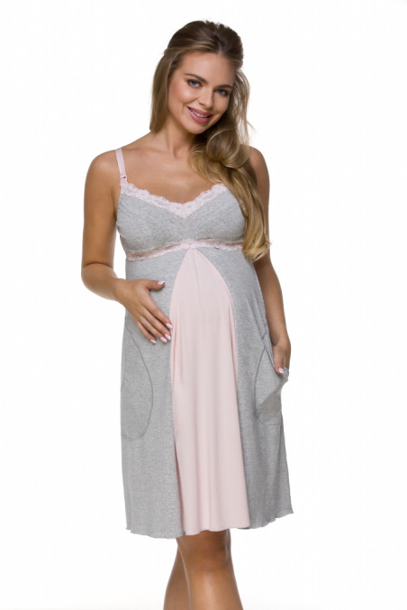 Koszulka szaro-różowa, na regulowanych ramiączkach z zapięciem click-clack, umożliwiającym swobodne karmienie piersią. Długość przed kolano, pod biustem wszyta gumka podtrzymująca piersi. Dekolt koszulki ozdobiony różową koronką. Koszulka posiada funkcjonalny fason odcinany pod biustem i rozszerzany ku dołowi, dzięki czemu pomieści nawet spory brzuszek.