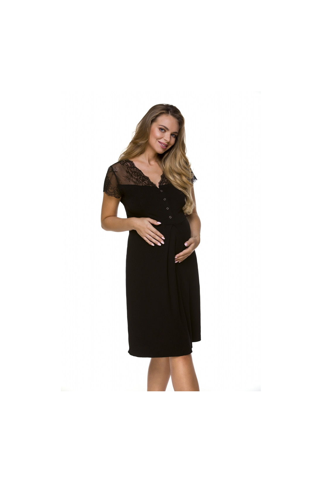 Koszula ciążowa i do karmienia piersią. Model z krótkim rękawem, długość do kolana, dekolt zapinany na napy. Góra koszulki wykonana z delikatnej koronki. Dodatkową cechą funkcjonalną są kieszenie po bokach koszulki. Model idealny do szpitala i na co dzień.
