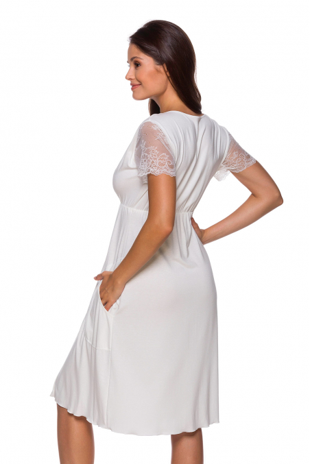 Koszulka ciążowa i do karmienia, z krótkim, koronkowym rękawkiem, długości przed kolano. Posiada funkcjonalny fason odcinany pod biustem i rozszerzany ku dołowi, dzięki czemu pomieści nawet spory brzuszek ciążowy. Dekolt efektownie ozdabia wytworna koronka. Po bokach koszulki kieszenie, w których przyszła mama będzie mogła mieć pod ręką niezbędne rzeczy.