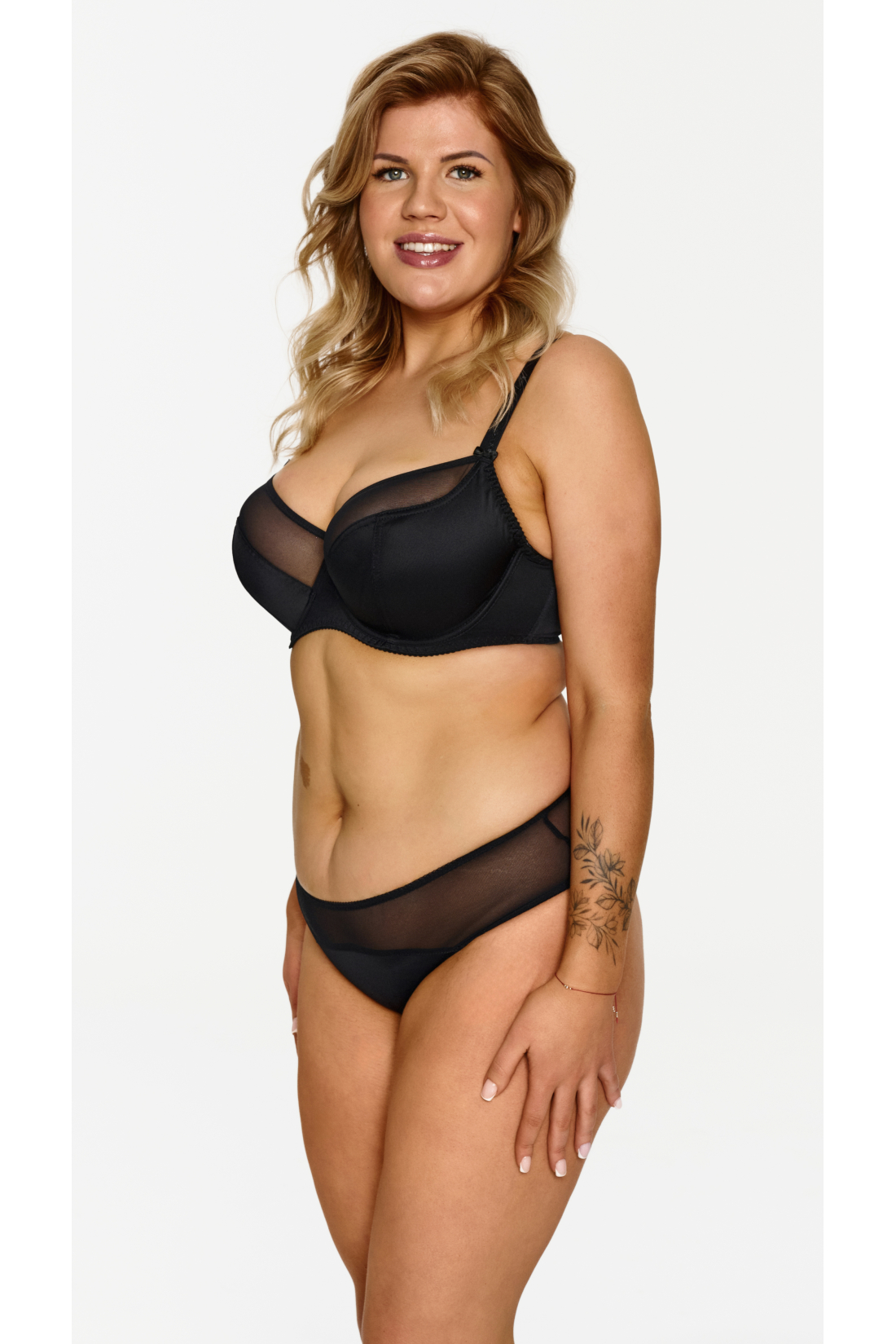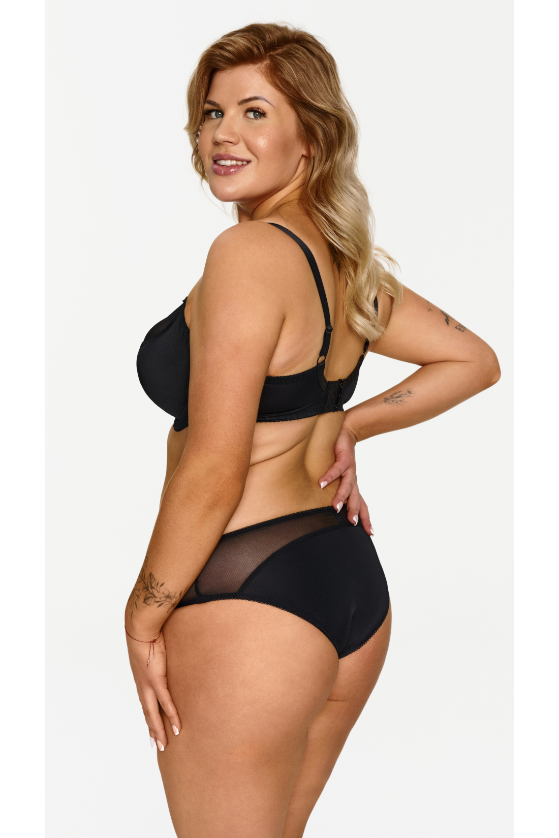 Figi z wyższym stanem, wykonane z połączenia gładkiej dzianiny oraz siatki w kolorze czarnym.