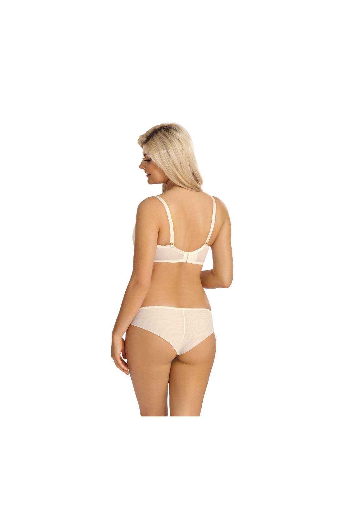 Figi wykonane z połączenia wzorzystego plenu oraz siatki w kolorze ecru.