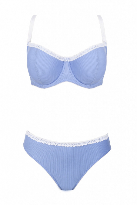 Biustonosz stworzony z myślą o mamie karmiącej. Model wykonany z dzianiny w kolorze lazurowego błękitu, bardzo delikatnej i przyjemnej w dotyku. Konstrukcja oparta na pionowym cięciu doskonale podtrzymuje biust i nadaje mu piękny kształt. Wykończenie wykonane z subtelnej koronki oraz ramiączka w białym kolorze nadają całości bardzo delikatny wygląd. Staniczek jest miękki na fiszbinie. Biustonosz wspaniale sprawdzi się podczas karmienia dzięki wygodnie odpinanym klipsom Clic-Clac umożliwiającym odpięcie i zapięcie miseczki jedną ręką, a tym samym karmienie dziecka bez zdejmowania biustonosza. Miseczki wyścielone od wewnątrz bawełną co podnosi komfort użytkowania.
