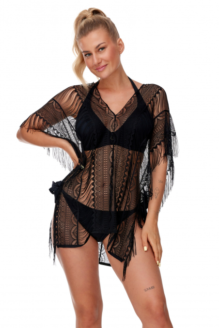 Piękne pareo w formie tuniki, wykonane z czarnej koronki z frędzelkami. Dekolt w literę V. Propozycja idealna zarówno na plażę oraz jako dodatek do letniej stylizacji.