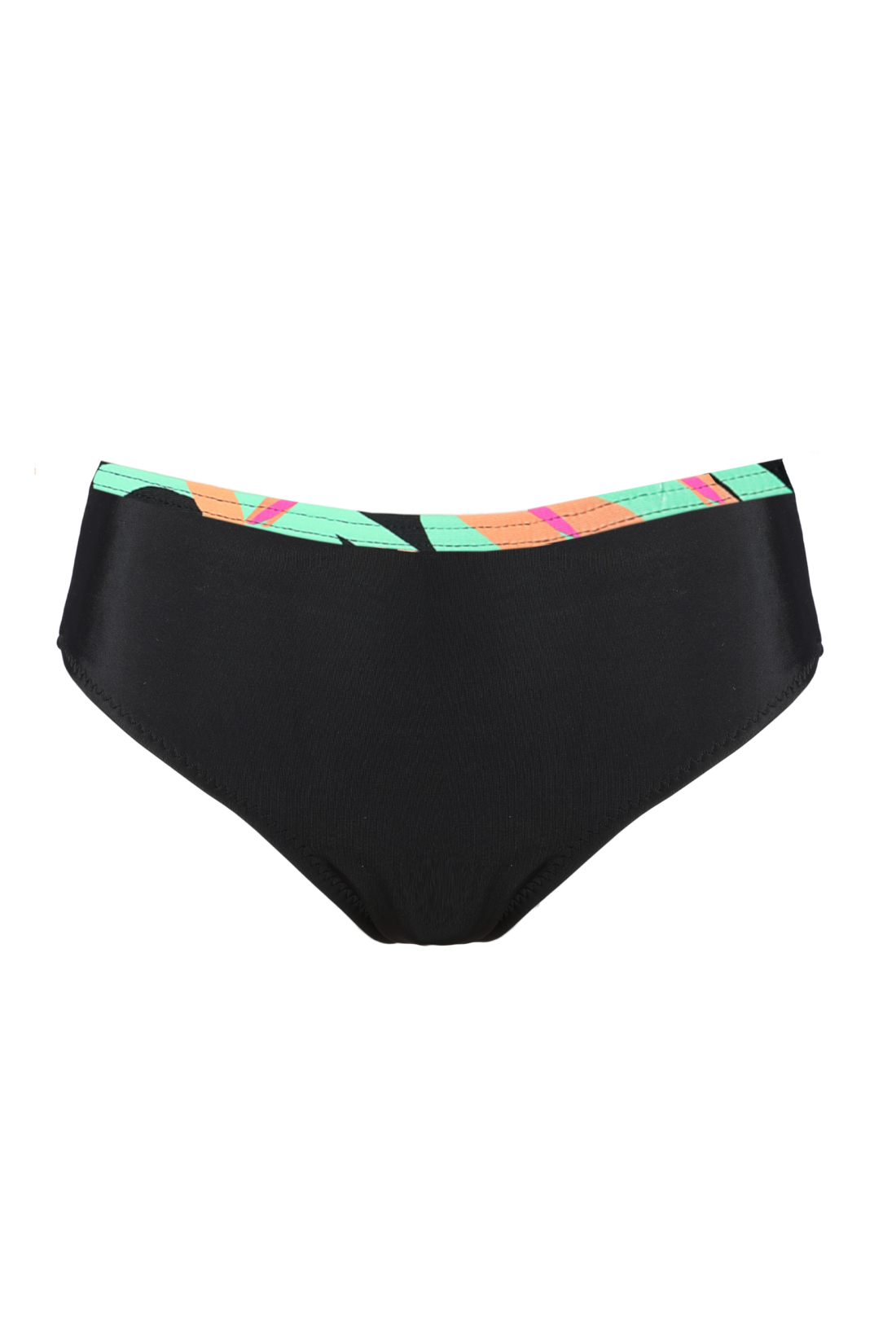 Figi klasyczne z wyższym stanem wykonane z dzianiny w czarnym kolorze, ozdobione w pasie lamówka z dzianiny wielokolorowej, tej samej co góra kostiumu.