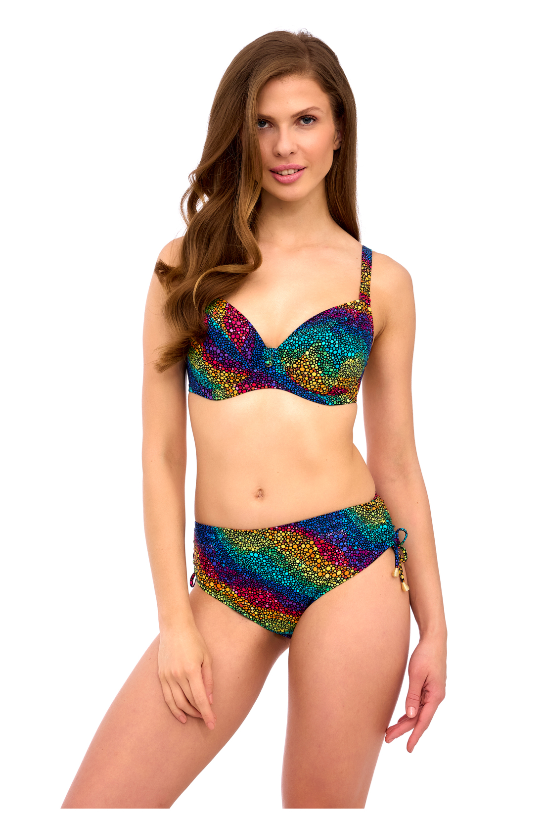 Klasyczne figi z wyższym stanem, wykonane z wielokolorowej dzianiny imitującej tęczę. Bardzo wygodny fason. Na bokach fantazyjne troczki zakończone złotą ozdobą. Pozwalają regulować wysokość i krój majtek.