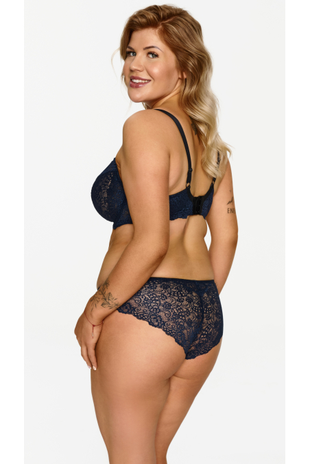 Granatowy biustonosz z miękkimi miseczkami na fiszbinach stworzony z myślą o pełniejszych biustach. Zapewnia stabilne podtrzymanie i naturalny kształt piersi, jednocześnie gwarantując wygodę noszenia. Miseczki zdobione koronką otulają biust subtelnym, zmysłowym wzorem. Między miseczkami znajduje się eleganckie złote zdobienie. Ramiączka regulowane, nieodpinane.