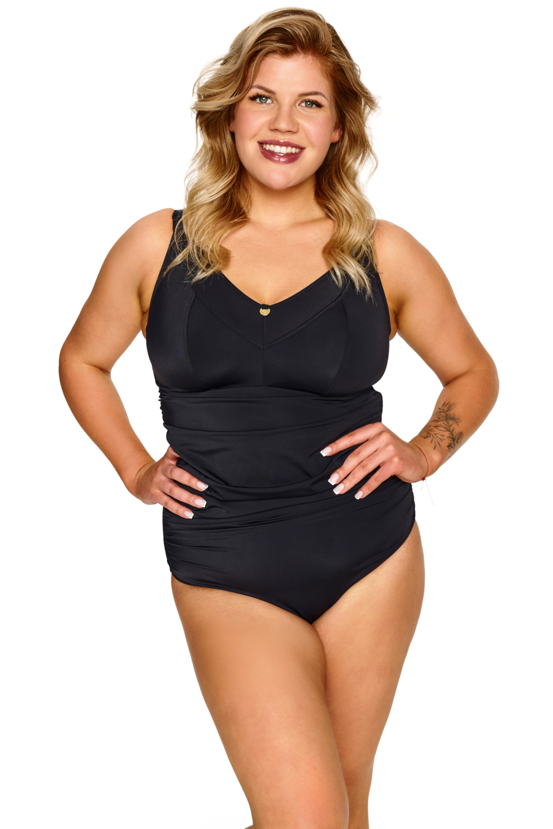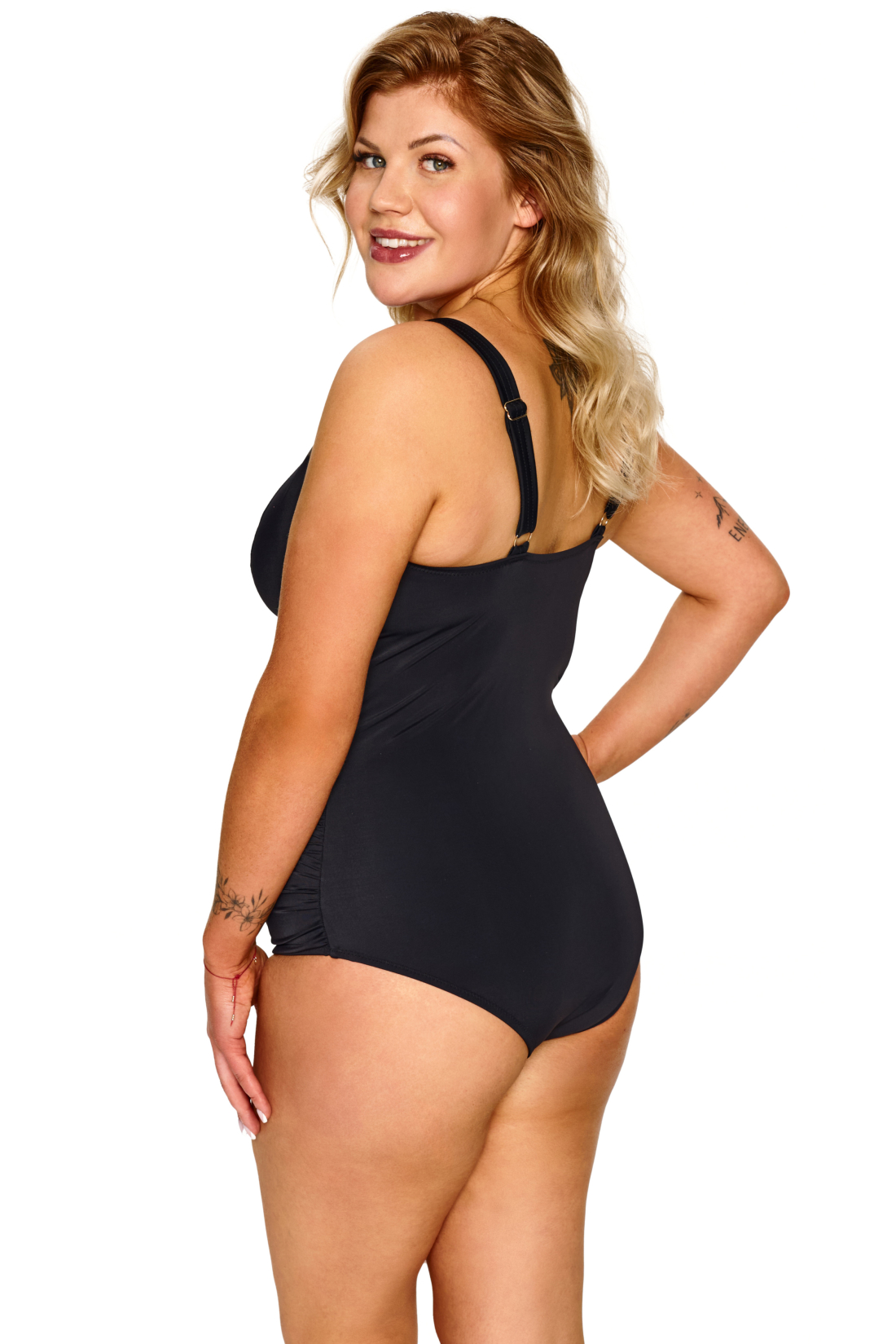 Jednoczęściowy kostium kąpielowy ZENITH został stworzony z myślą o kobietach, które cenią sobie komfort i styl. Bezfiszbinowe miseczki zapewniają naturalne podtrzymanie i swobodę ruchu, a delikatne marszczenia w talii subtelnie ukrywają mankamenty, dyskretnie modelując sylwetkę. Zabudowany dekolt i część majteczkowa gwarantują pełną wygodę i poczucie pewności siebie. Złoty detal przy dekolcie wprowadza nutę elegancji, czyniąc kostium wyjątkowym na plaży i przy basenie. Ramiączka regulowane, nieodpinane. ZENITH to doskonały wybór dla Pań o pełniejszych kształtach — bo komfort może iść w parze z klasycznym szykiem.