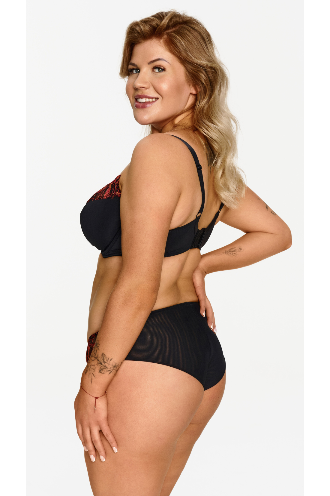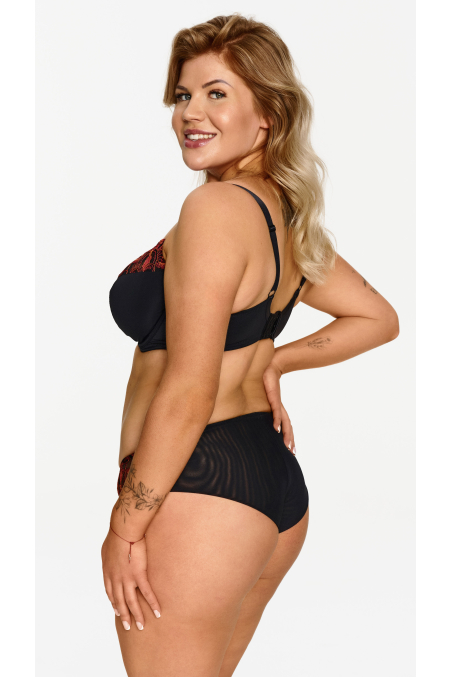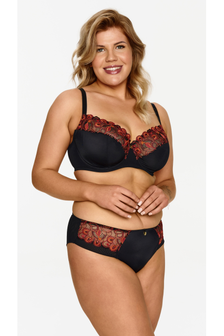 Ten miękki biustonosz z fiszbinami to idealny model na większy biust. Miękkie miseczki z fiszbinami świetnie podtrzymują, a jednocześnie pozwalają zachować naturalny kształt piersi. Czarna baza ozdobiona haftem w ciepłych jesiennych barwach sprawia, że biustonosz wygląda bardzo elegancko i stylowo.