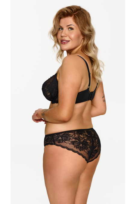 Czarny biustonosz z miękkimi miseczkami i fiszbinami, wykonany z lekkiej koronkowej siateczki. Konstrukcja zapewnia stabilność oraz optymalne ułożenie i podtrzymanie biustu. Ramiączka nieodpinane, regulowane.