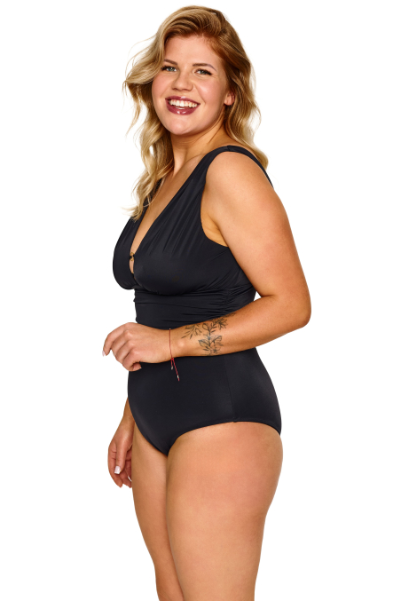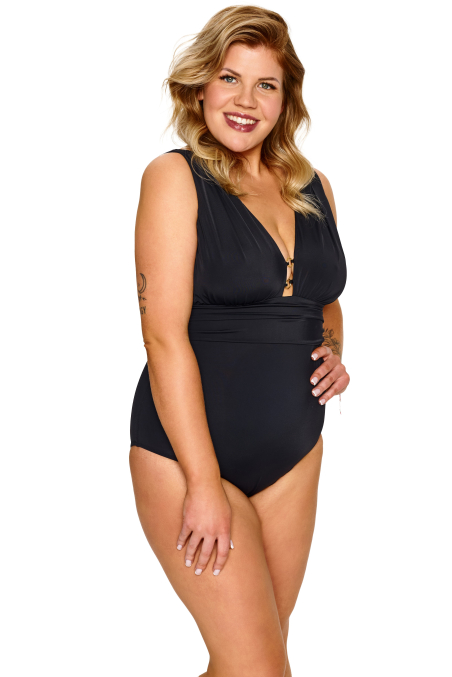 Elegancki i kobiecy jednoczęściowy kostium kąpielowy, zaprojektowany z myślą o komforcie i pięknym podkreśleniu sylwetki. Głęboki dekolt w kształcie litery V subtelnie eksponuje biust, a delikatne marszczenie w okolicy talii optycznie modeluje figurę i wysmukla sylwetkę. Łączenie misek ozdabiają dwa złote kółeczka, dodając całości szyku i elegancji. Szerokie ramiączka zapewniają stabilne podtrzymanie i wygodę noszenia, a klasyczny krój sprawia, że kostium doskonale sprawdzi się zarówno na plaży, jak i na basenie. Minimalistyczny design nadaje całości ponadczasowego, eleganckiego charakteru.