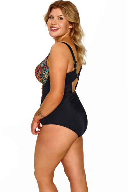 Jednoczęściowy kostium wykonany z dzianiny w czarnym kolorze oraz kolorowej z motywem tęczy kropeczek. Doskonały do użytku zarówno na plaży jak i na basenie. Fason stroju łączy funkcjonalność oraz elegancję. Kostium posiada wszyty biustonosz z miękkimi miseczkami na fiszbinach oraz regulowane, nieodpinane ramiączka. Szerokość i typ ramiączek dopasowane do rozmiaru kostiumu. Wstawki z czarnego materiału po bokach optycznie wyszczuplają i modelują sylwetkę. Tył kostiumu zapinany na klamrę.