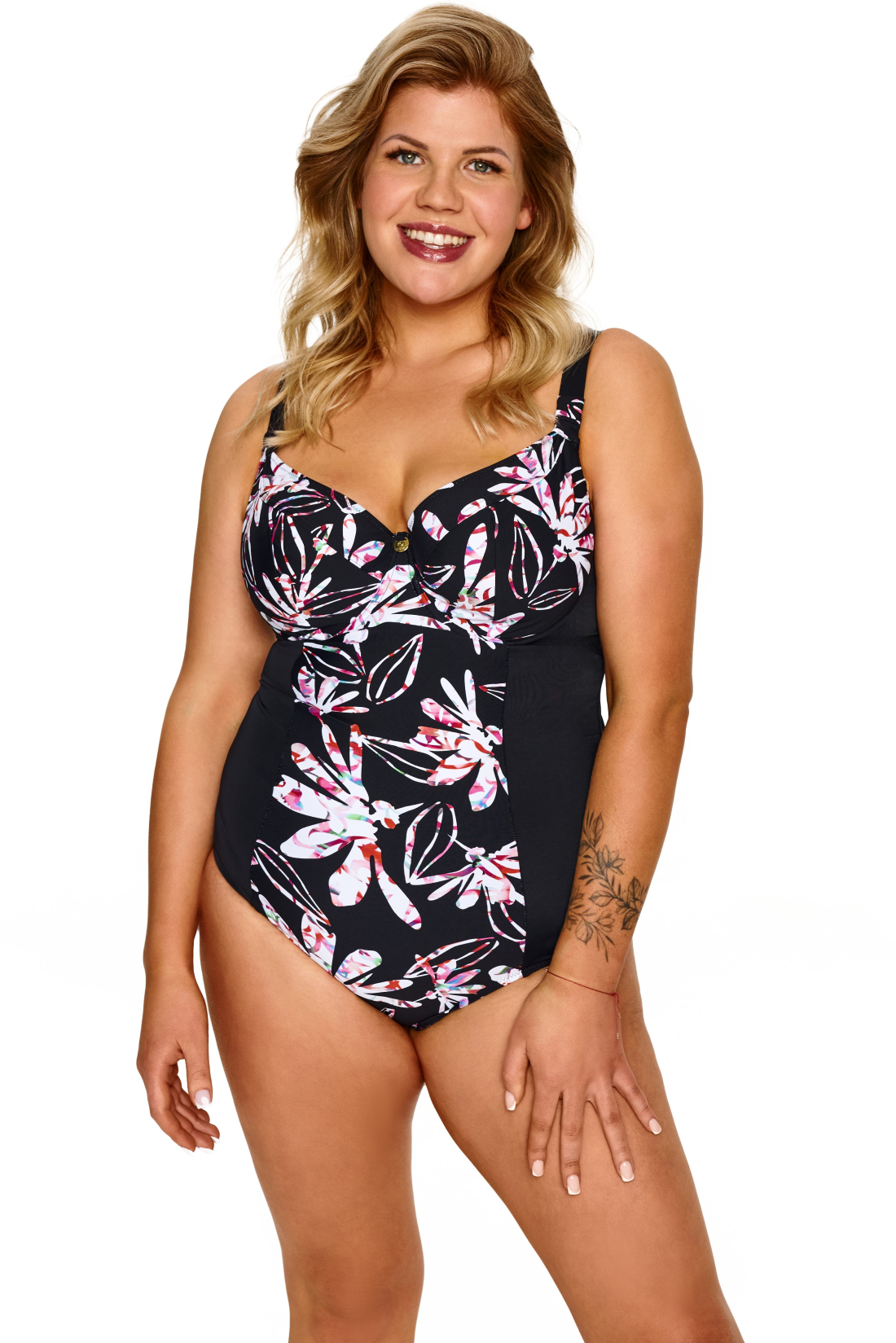 Jednoczęściowy kostium kąpielowy o kobiecym, modelującym kroju, zaprojektowany z myślą o większym biuście i komforcie noszenia.