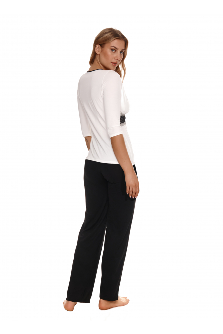 Dwuczęściowa piżamka, niezwykle elegancka, a przy tym komfortowa. Bluzka od piżamki z rękawkiem 3/4. Dekolt w kopertę, podkreślony został czarną lamówką, zaś linię misek podkreśla czarna koronka oraz delikatna kokardka. Dół piżamki stanowią czarne, długie spodnie, które kontrastują z górą.